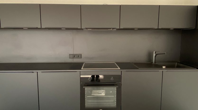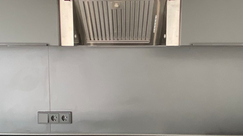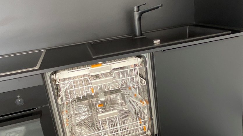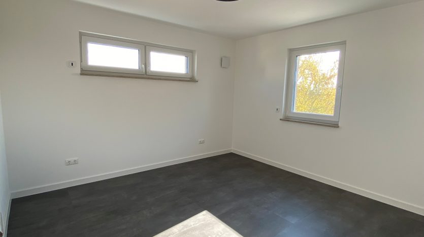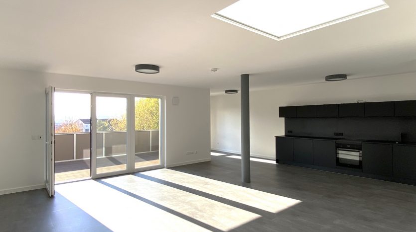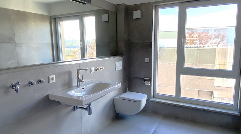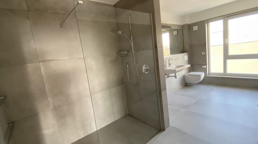 Einbauküche in schwarz mit qualitativ hochwertigen, unbenutzten Geräten; Lampen in der Wohnung aus Beton „Artylux“; Innentüren Sonderanfertigung Design gebürstet; Badezimmerzimmerspiegel ebenfalls eine Sonderanfertigung; der ursprüngliche Grundriss wurde dahingehend verändert, dass aus dem Kinderzimmer das Badezimmer geworden ist und somit ein altengerechtes, großzügiges Bad mit schwellenloser, bodentiefer großer Dusche, großem Waschtisch und WC sowie Waschmaschinen-anschluß; Bodenbelag aus Feinsteinzeug in Großformat und Betonoptik; vollautom. Belüftungsanlage; 3-fach verglaste, innen weiße und außen graue, Kunstoff-Fenster; Kellerabteil; Fahrradkeller;